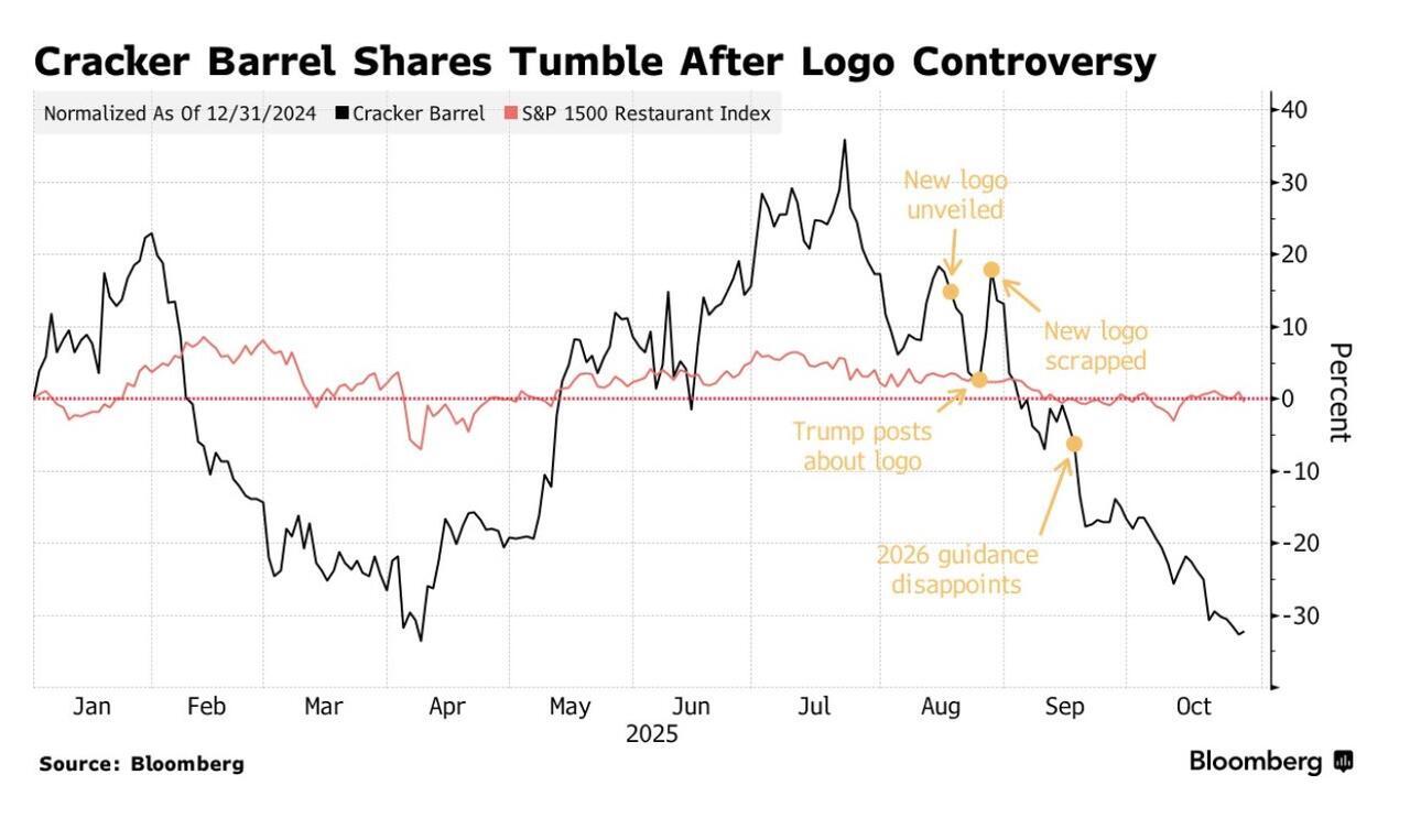 Cracker Barrel tried to go “modern,” and eight days later had to shove Uncle Herschel back into the logo. Two months on, investors are still cleaning up the mess — the stock is down 32% this year and inching toward its 2008 financial-crisis faceplant.