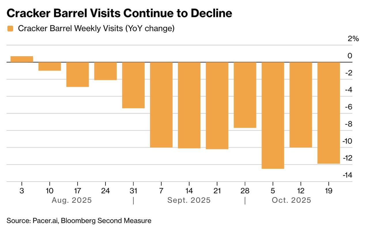 Bloomberg writes that traffic hasn’t recovered even after firing the marketing firm and scrapping remodel plans, per Placer.ai data. Cracker Barrel’s defense: “We’ve taken recent guest feedback to heart and are moving forward with a renewed focus on the food and guest experience.”