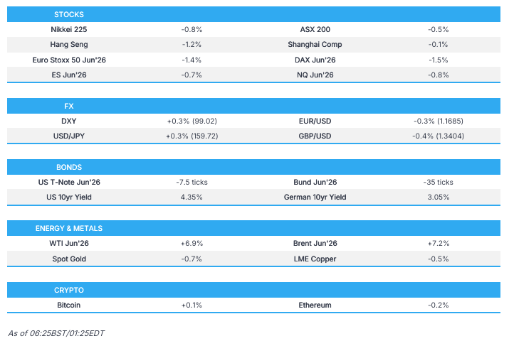 - APAC stocks declined; European equity futures indicate a lower cash market open with Euro Stoxx 50 futures down 1.4%, off worst levels.