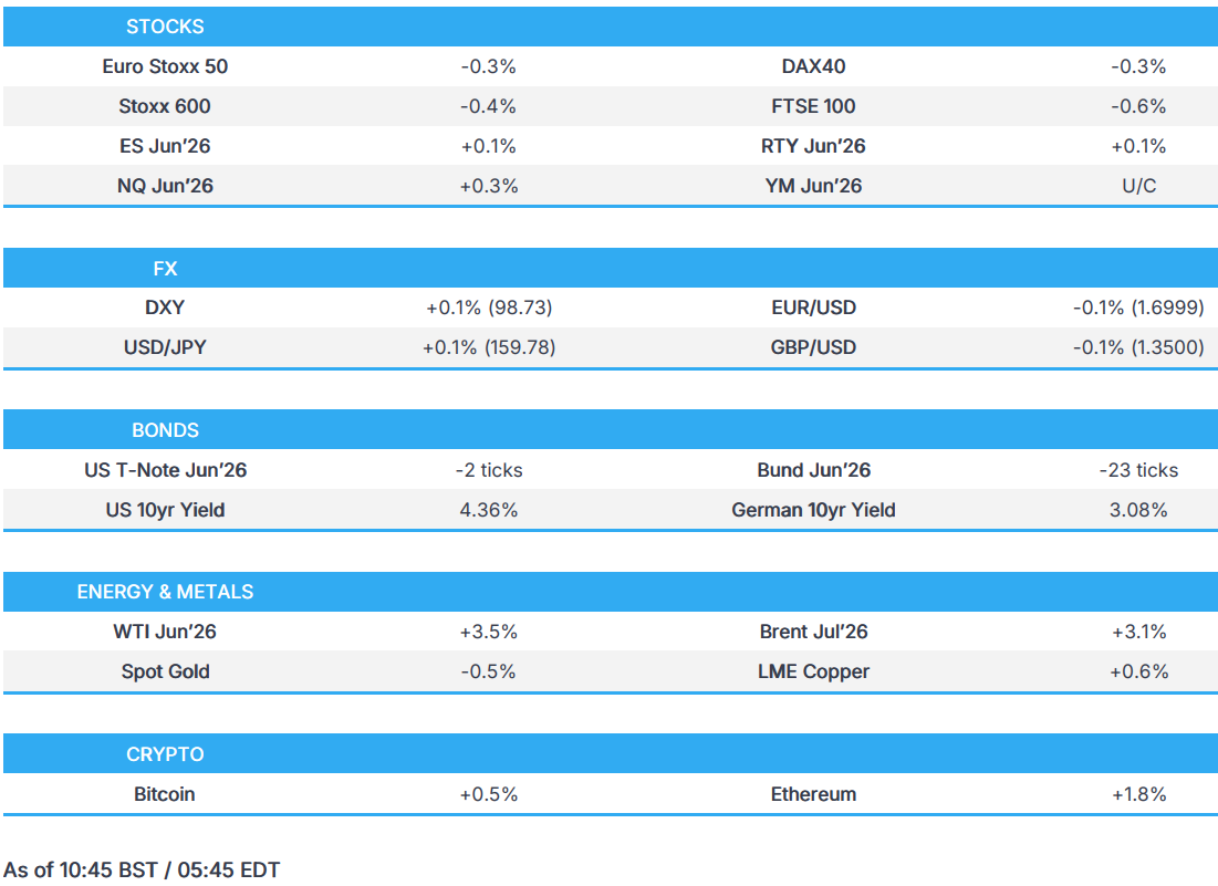 • European bourses (STOXX 600 -0.4%) began the session on a weaker footing as geopolitical headlines dictate the tape with WSJ reporting "Trump told officials to prepare for an extended blockade of Iran" and the US President posting this morning, "Iran can’t get their act together. They don’t know how to sign a non-nuclear deal. They better get smart soon! President DJT".