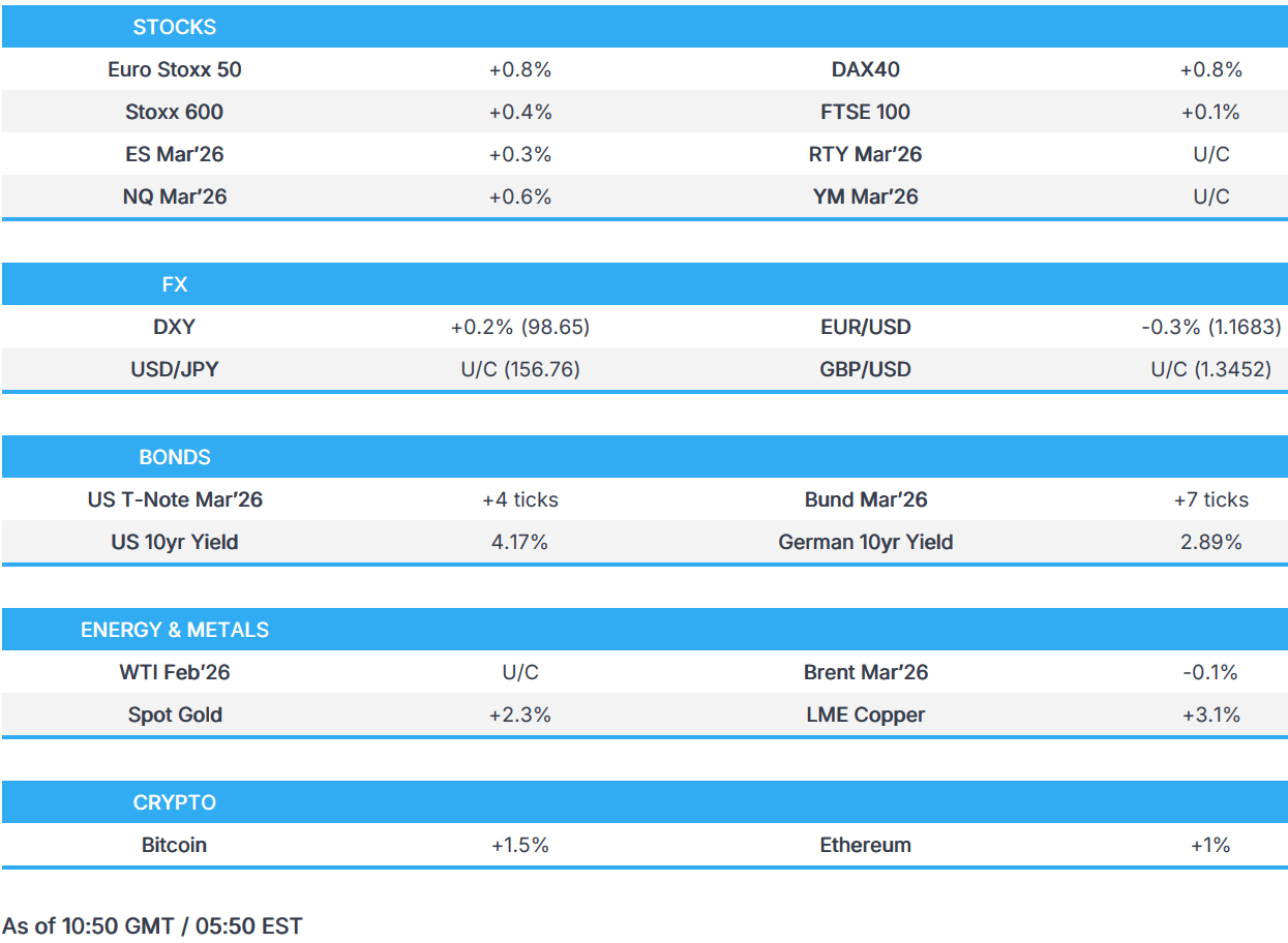 - ASML (+3%) has been boosted after Bernstein named the Co. as its top pick for 2026, citing a combination of accelerating memory investment and a more attractive valuation backdrop; its updated PT of EUR 1300/shr (prev. EUR 800/shr), implies a circa 30% gain from current levels.