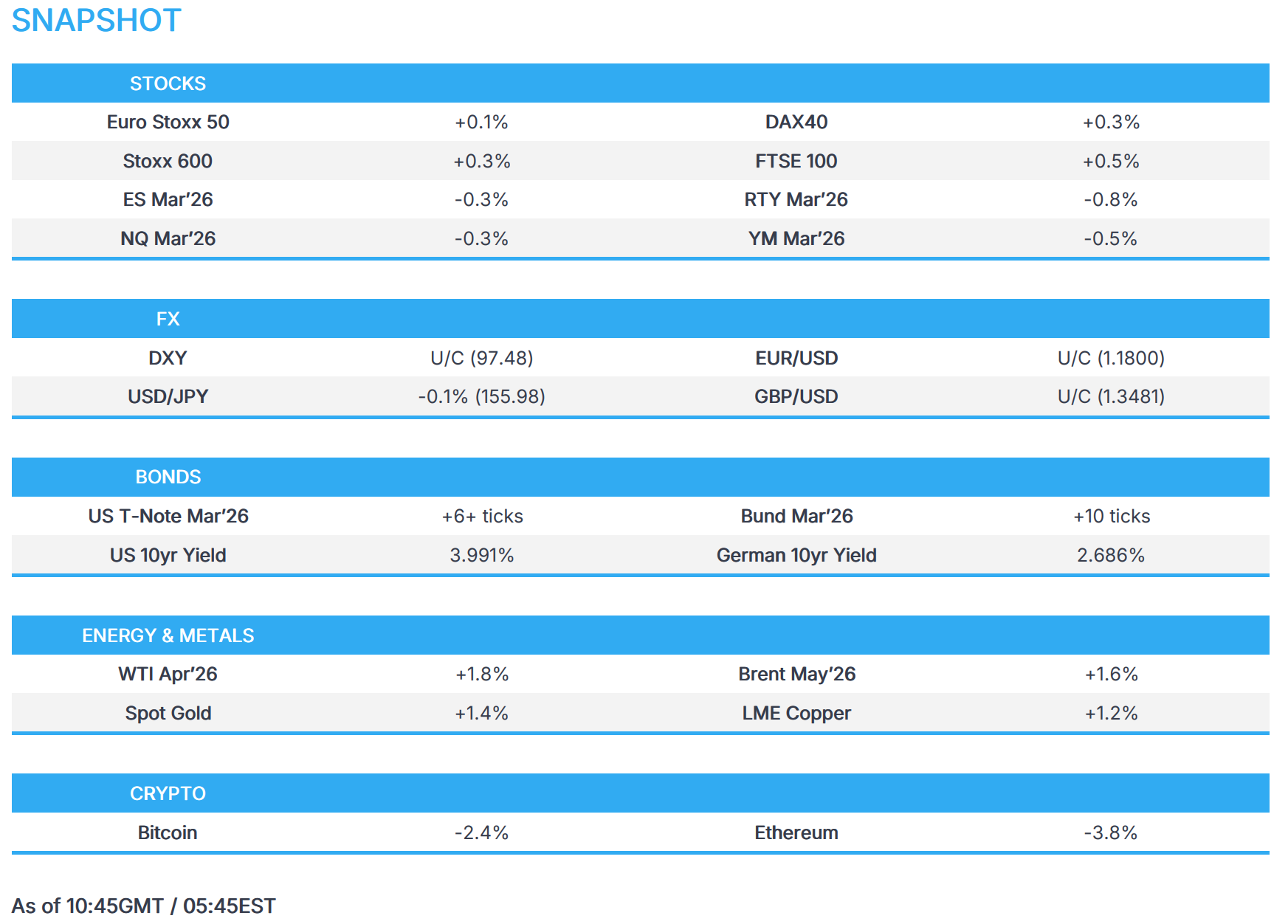 - European sectors are mixed. Telecommunications (+1.3%) outperform after Spain's Cellnex (+0.6%) saw 2025 operating profit rise more than double annually and Telefonica (+3.7%) reportedly negotiating the purchase of 1&1 (+9.4%)in Germany in a EUR 5bln deal. On the flip side, Travel and Leisure (-1.8%) is underperforming despite positive IAG (-5.5%) earnings, in which the Co. beat FY profit expectations and announced a EUR 1.5bln share buyback.