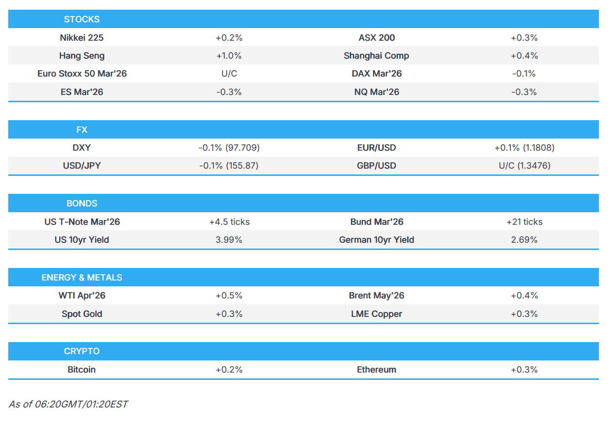 - US equity futures remained subdued following the recent tech weakness and NVIDIA's failure to inspire despite its earnings beat, while geopolitical uncertainty continues, as although US-Iran talks in Geneva were said to be positive, the sides failed to reach an agreement, and the risk of a US strike on Iran remains.