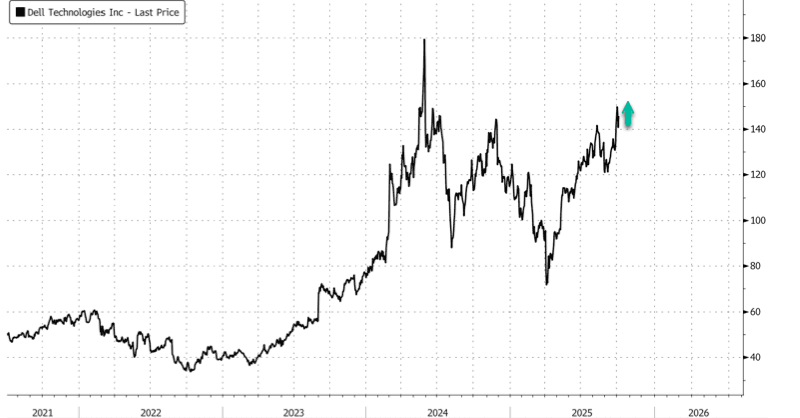 Shares of Dell Technologies jumped in premarket trading in New York after executives are expected to unveil a sharply higher long-term financial outlook at the company's Securities Analyst Meeting on Tuesday morning, boosting confidence in AI-driven demand across its data center and PC units. It seems that with each passing day, more AI-related headlines, from Monday's AMD-OpenAI deal to the ongoing AI vendor-financing "circle jerk", continue to propel AI and chip stocks to record highs.