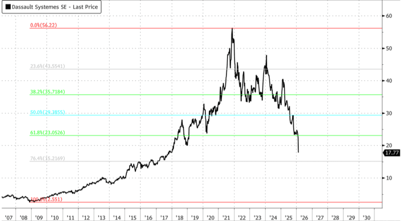 Shares in Paris posted their steepest decline on record, plunging 22%. The bull market peaked in 2021, and the liquidation phase has been ongoing since 2024. The next technical level to watch is the 76.4% Fibonacci retracement, around 15 euros.