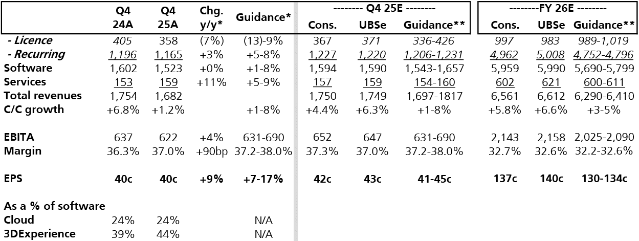 A: Q4 revenues of €1,682m (cons. €1,750m) grew by 1.2% c/c (guidance 1-8%) and just 0.6% organically to €1,682m, with a weak Auto sector in Europe called out. Within this, total Software was flat at €1,523m (guidance 1-8%) with licences down 7% y/y to €358m and at the lower-end of guidance for (13)-9%, while recurring software grew by just 3% to €1,165m (guidance: +5-8%) with subscription up just 4% (guidance 8-12%) and support 2%. Q4 cloud revenues grew by 9% (Q3 25: +8%) but were up 38% for 3DX as Life Sciences fell by 4% y/y with Medidata impacted by lower study volumes. For the year, Medidata reported 1% growth in Direct Enterprise sales (70% of the total) - and would have been +6% excl. Moderna - but CRO volumes (30% of the total) fell by 5%. Q4's EBIT of €622m/37.0% was 5% below cons. of €652m/37.3% and light of guidance for 37.2-38.0%.