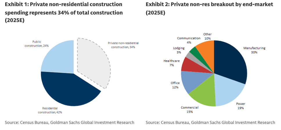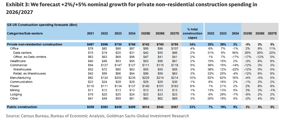 "We come away from our discussion with a continued outlook for private non-residential construction spending to return to growth in 2026 vs 2025, with strength led by data centers, power infrastructure, and healthcare," Goldman analysts led by Adam Bubes wrote in a note on Tuesday.