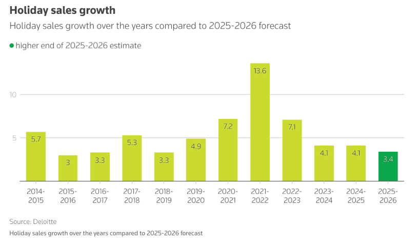 Deloitte forecasts holiday sales will rise just 2.9% to 3.4% between November 2025 and January 2026, compared with a 4.2% increase last year, marking the slowest pace since the pandemic. That translates to $1.61 trillion to $1.62 trillion in sales, up from $1.57 trillion the previous year.