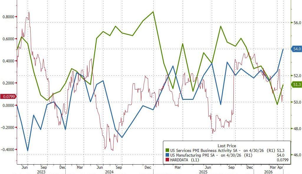 Despite the recent slide in 'hard' macro data, analysts expected an incremental improvement in the preliminary April S&P Global PMI data this morning.