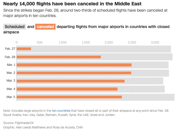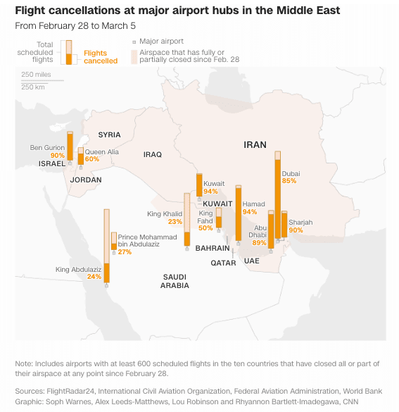 The epicenter of the disruption is Persian Gulf airports and airlines. As of Friday, ten countries had closed their airspace, either partially or completely, since Operation Epic Fury against Iran began one week ago, according to Flightradar24 data.