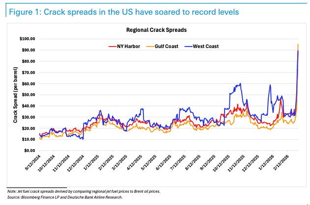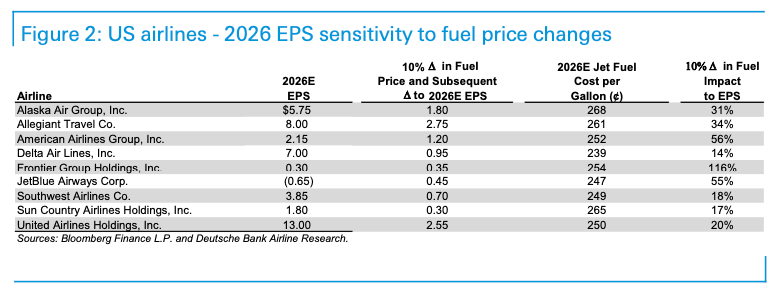 The big risk flagged by Deutsche Bank analysts, led by Michael Linenberg, is that surging jet fuel prices could hit some of the weakest airlines.