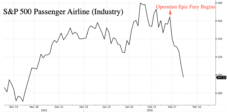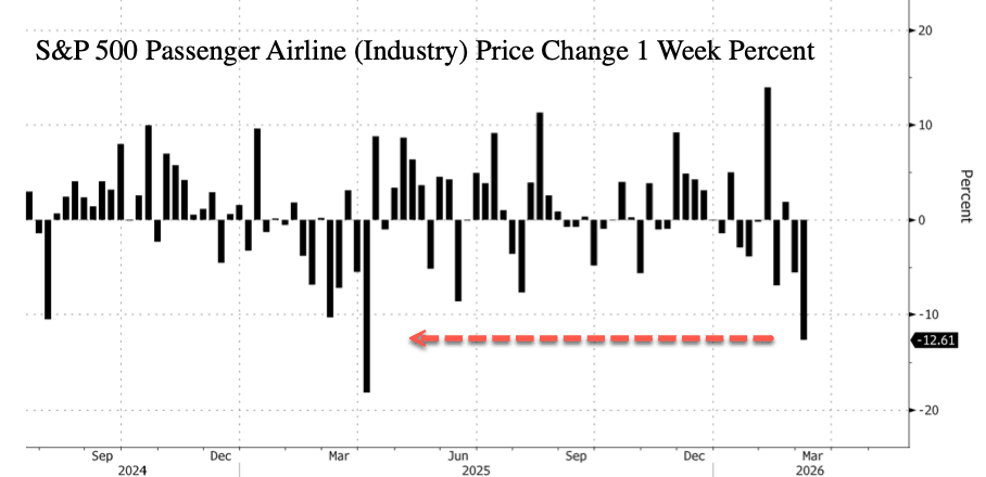 Looking at airline stocks, the S&P 500 Passenger Airlines Index fell 12.6% on the week, marking its largest decline since the 18% drop in the first week of April 2025, when Trump and China argued back and forth over trade.