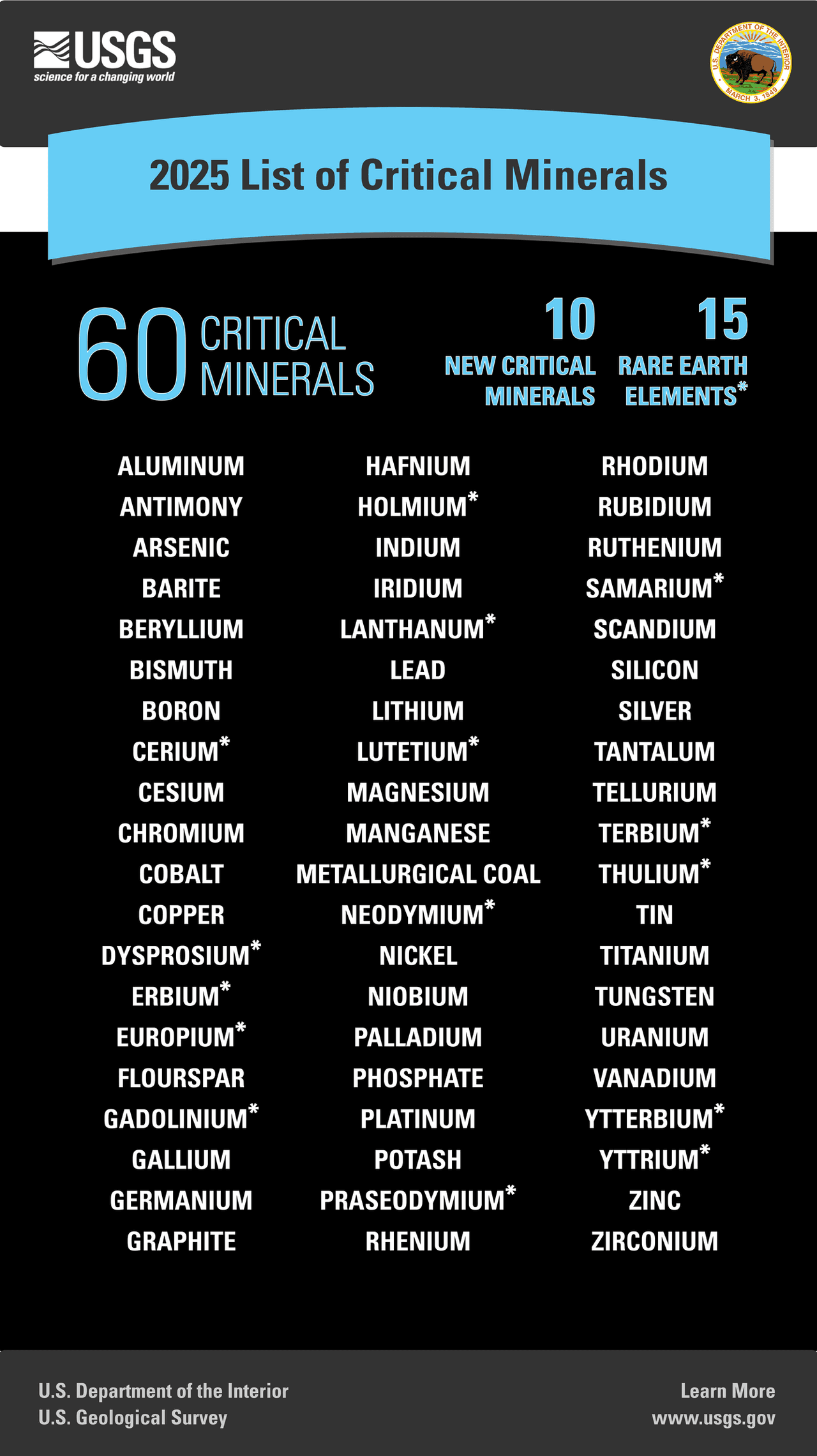 The list also informs direct investments in mining and resource recovery from mine waste, stockpiles, tax incentives for US mineral processing as well as streamlined mining permitting.