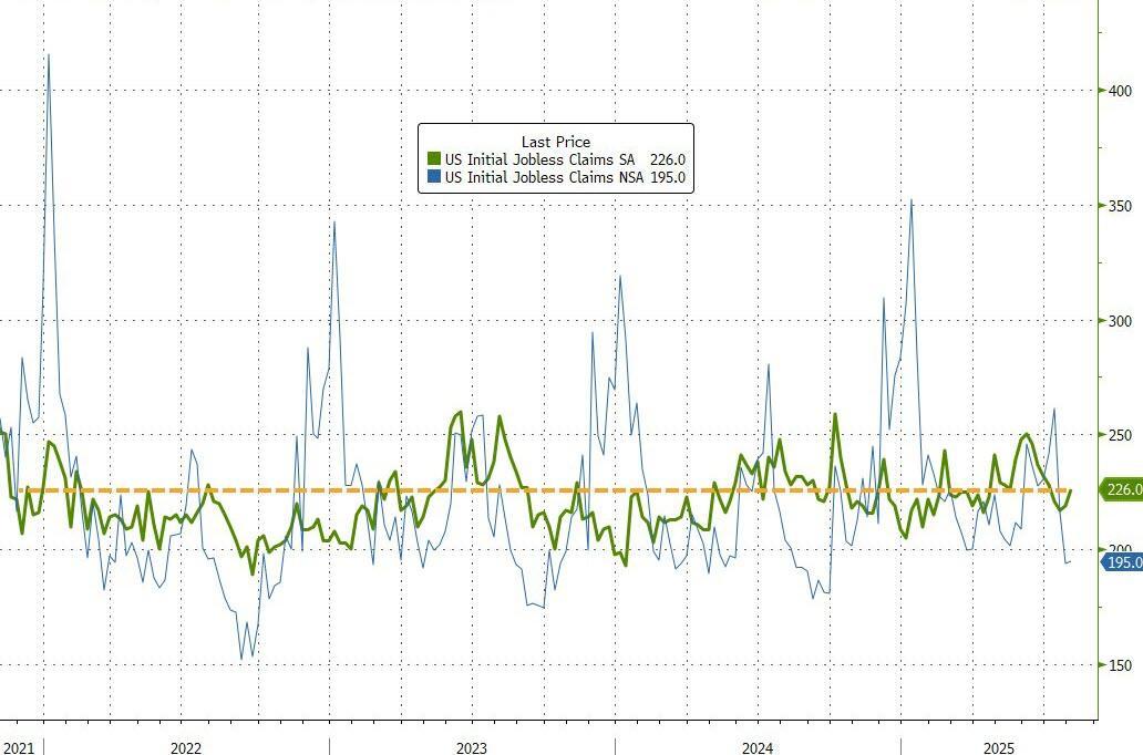The number of Americans filing for jobless benefits for the first time rose very modestly last week (from 219k to 226k) but remains basically unchanged for the last four years...