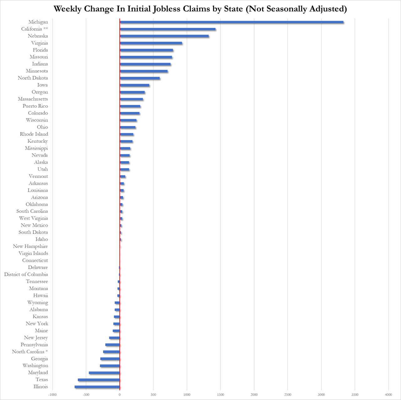 Michigan (and an estimated California) saw the biggest jump in initial claims while Illinois and Texas saw the biggest drop in initial claims last week...