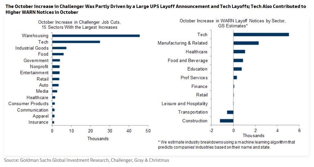 So far, Goldman does not find clear evidence that most of the increase in these layoff measures is directly motivated by AI, although tech industries saw meaningful increases in layoffs in October across both measures.