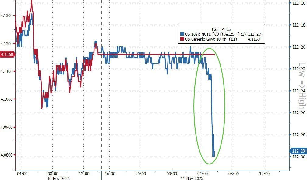 Cash bonds are closed for Veterans Day but futs signal a drop of about 4bps for the 10Y yield...