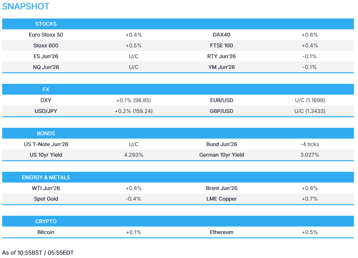 - Fixed benchmarks are flat/mixed this morning, as the complex awaits US CPI later today and heading into the weekend, where US and Iranian officials are to meet for peace talks in Pakistan. While preparations are proceeding "full steam ahead" in the Pakistani capital, both sides have issued warnings that could still derail the meeting. Heading into the confab, US President Trump said he is optimistic that an Iran peace deal is within reach, but warned that if no deal is reached, “it is going to be very painful”.