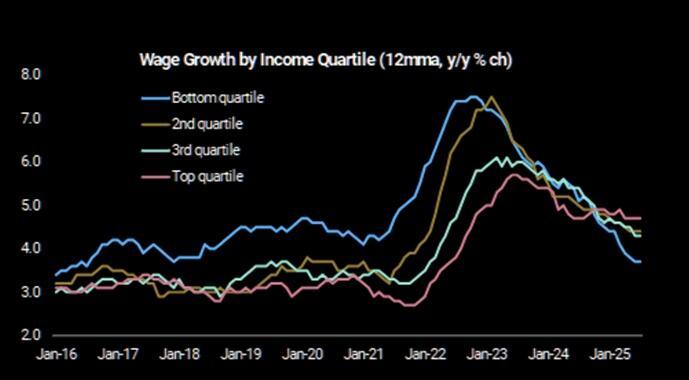 First, financial conditions have eased substantially since late last year. Despite the Fed maintaining higher policy rates, markets have pushed bond yields lower and credit spreads tighter. Equities have rallied, creating a wealth effect that supports consumption, at least within the top 10% of the population that owns 87% of the equity market. Furthermore, the top 40% of income earners currently account for 60% of total consumption.