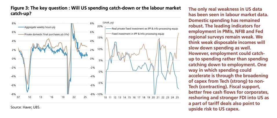Third, fiscal support remains more robust than many acknowledge. Federal spending continues at a high level, with infrastructure outlays and industrial policy subsidies supporting investment in energy, manufacturing, and technology. These initiatives feed directly into corporate capital expenditures. The AI investment boom is a clear example of spending accelerating not just in “big tech,” but across the industrial supply chain. UBS has flagged this emerging capex cycle as a significant tailwind for mid-cycle expansion, which could offset a slowdown in consumer spending.