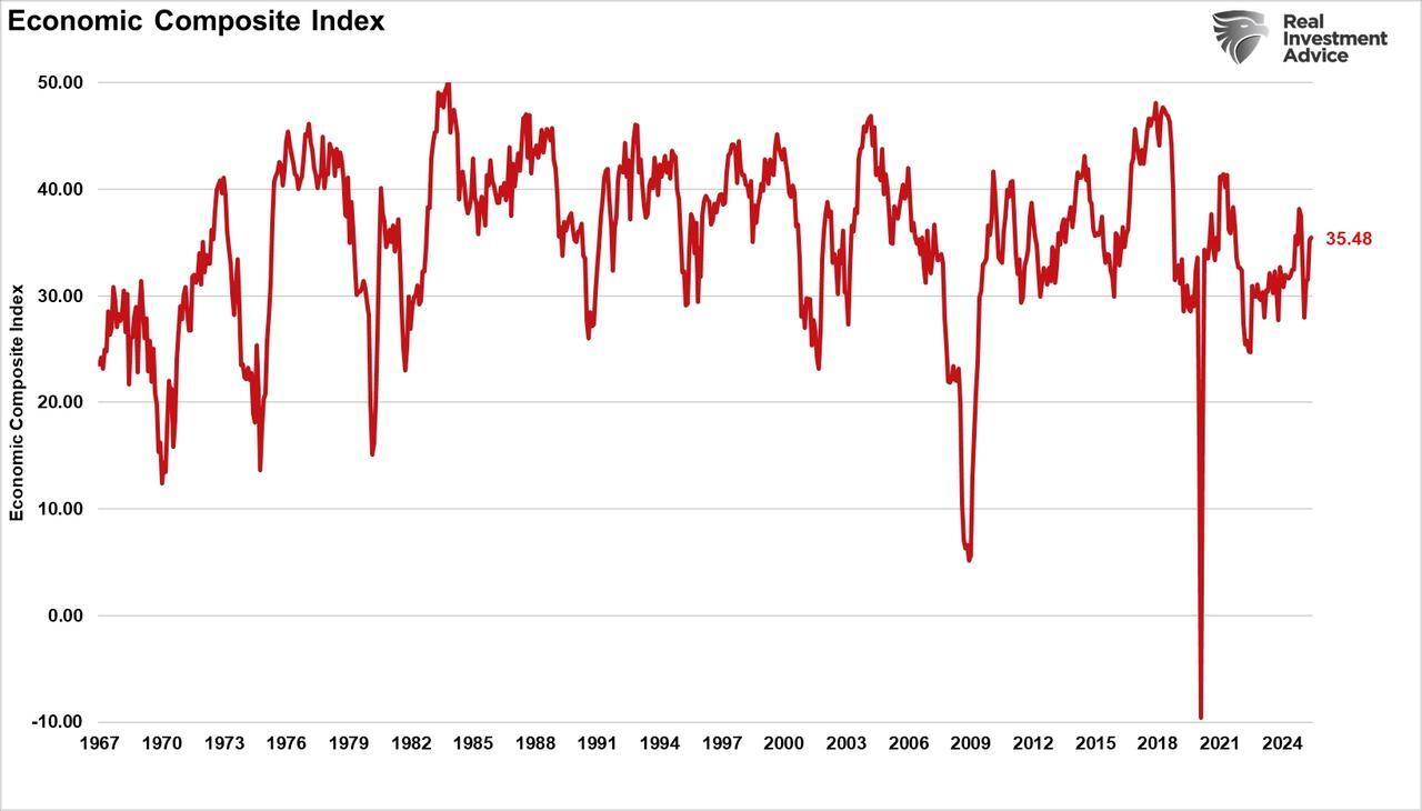 Finally, there is the issue of data distortion. In recent months, significant revisions have been made to payrolls and GDP. Preliminary reports painted a picture of sharp deceleration, only for final data to show much more resilience. Goldman has warned that headline data may be underestimating actual activity. If that’s true, the economy may not need to rebound; it may already be stronger than it appears. We also see improvement in the Economic Composite Index, which comprises more than 100 data points, including manufacturing, services, leading indicators, and other economic factors.