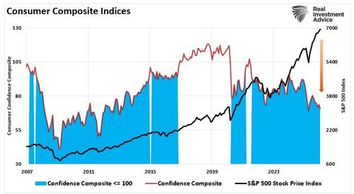 Secondly, the divergence also highlights distributional issues. As noted above, aggregate growth does not capture income and wealth disparities. While high-income households account for 50% of spending, lower-income households are less likely to fully benefit from macroeconomic expansion. That reality contributes to weak sentiment. This leaves the markets exposed to events that cause high-income earners to cut spending. Such is particularly the case when there is no buffer between the “haves” and “have-nots.”
