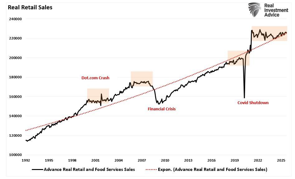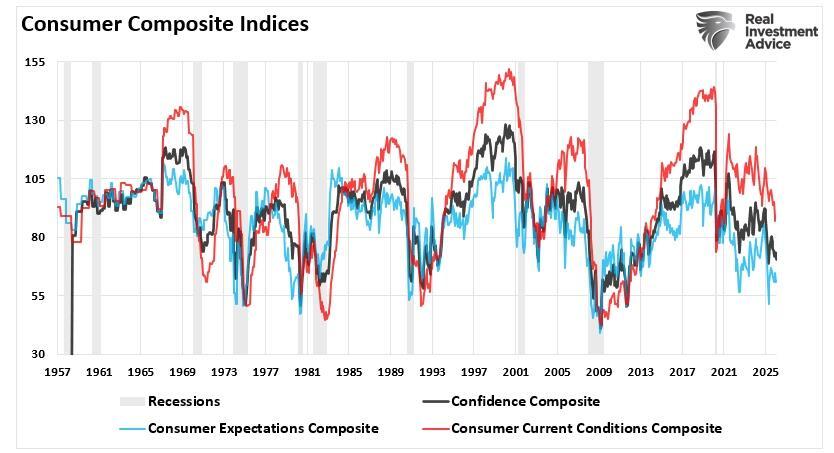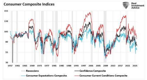 Notably, the divergence between sentiment and economic data is not unique to this moment. Analysts have long noted that consumer mood often lags hard data, and we hope to see sentiment turn higher if the economy continues to expand. It is worth stating that in the short term, surveys often reflect fear and uncertainty, which may depress sentiment even if actual spending behavior remains relatively strong. However, while nominal data suggests that consumer spending remains resilient, that resilience has not been a function of “buying more” products, but simply buying the same amount, or less, at higher prices, which certainly explains the decline in sentiment readings.