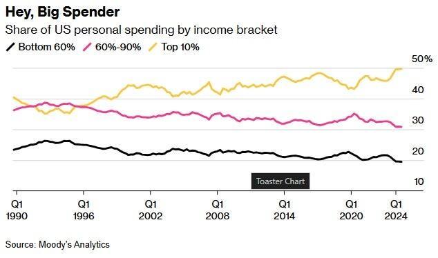 Crucially, economic growth numbers focus only on aggregate performance and do not capture income distribution, regional variations, or the lived experiences of millions of households. A good example of this is the share of U.S. spending by income bracket. Currently, roughly 50% of all consumer spending is driven by the top 10% of income earners, and is increasing, while it is falling for the bottom 90%.