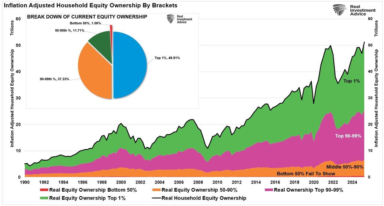 Another problem with the headline data is that while stock market performance has exceeded historical expectations, its impact on the overall economy has become more muted. While equity values have surged, creating a “wealth effect” that supports consumption, that effect remains primarily confined to the top 10% of the population that owns 87% of the equity market. As noted above, the top 40% of income earners currently account for roughly 80% of total consumption.