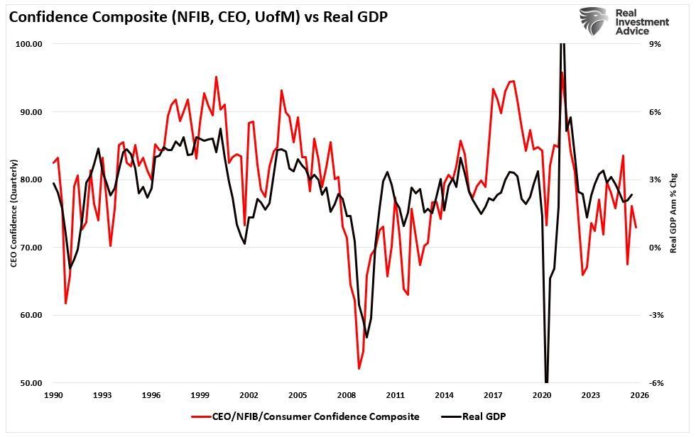 Crucially, understanding that if consumer sentiment drives consumption, and consumption makes up 68% of the economy, that consumption is the demand for small and large businesses. Therefore, if economic growth is robust, we should see demand reflected in increased sentiment across the spectrum. However, as the combined composite shows, those sentiment readings remain weak. Note the correlation between sentiment and the future direction of economic activity.