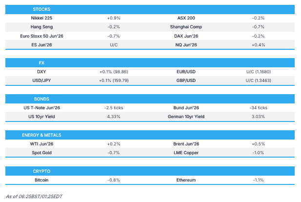 - APAC stocks traded mostly in the red, ex. Nikkei 225; European equity futures are indicative of a softer open with the Euro Stoxx 50 futures -0.7%.