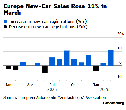 European auto sales posted their strongest monthly gain in almost two years in March, as robust demand emerged for fully electric and hybrid models. The surge in demand follows the US-Iran conflict, which disrupted energy flows through the Hormuz chokepoint. As a result, petrol and diesel prices at the pump in Europe soared. Another issue is China flooding the continent with cheap EVs, undercutting already struggling domestic automakers.