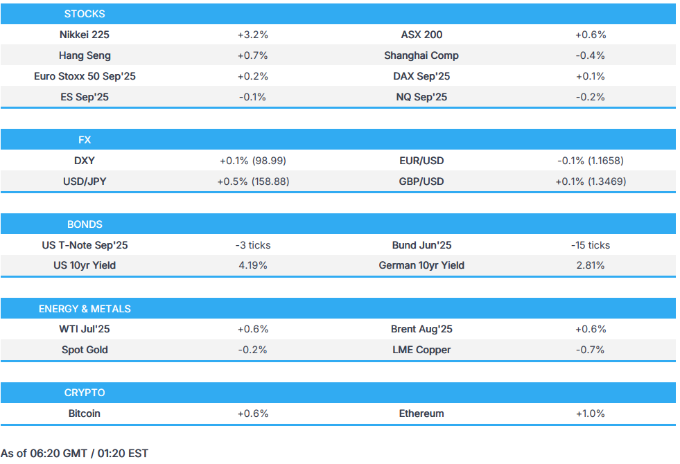 - US stocks managed to close in the green, seeing gradual strength throughout the session, paring the weakness seen overnight. The Russell outperformed while sectors were mixed. Consumer Staples led the gains, largely due to Walmart (WMT) rising on news that it is to be added to the Nasdaq 100 index. Financials lagged, however, on Trump's aim at credit card fees, calling on them to be capped - which hit banks ahead of earnings. Elsewhere, focus lay largely on Fed independence threats after the DoJ investigation into Fed Chair Powell over building renovation costs.