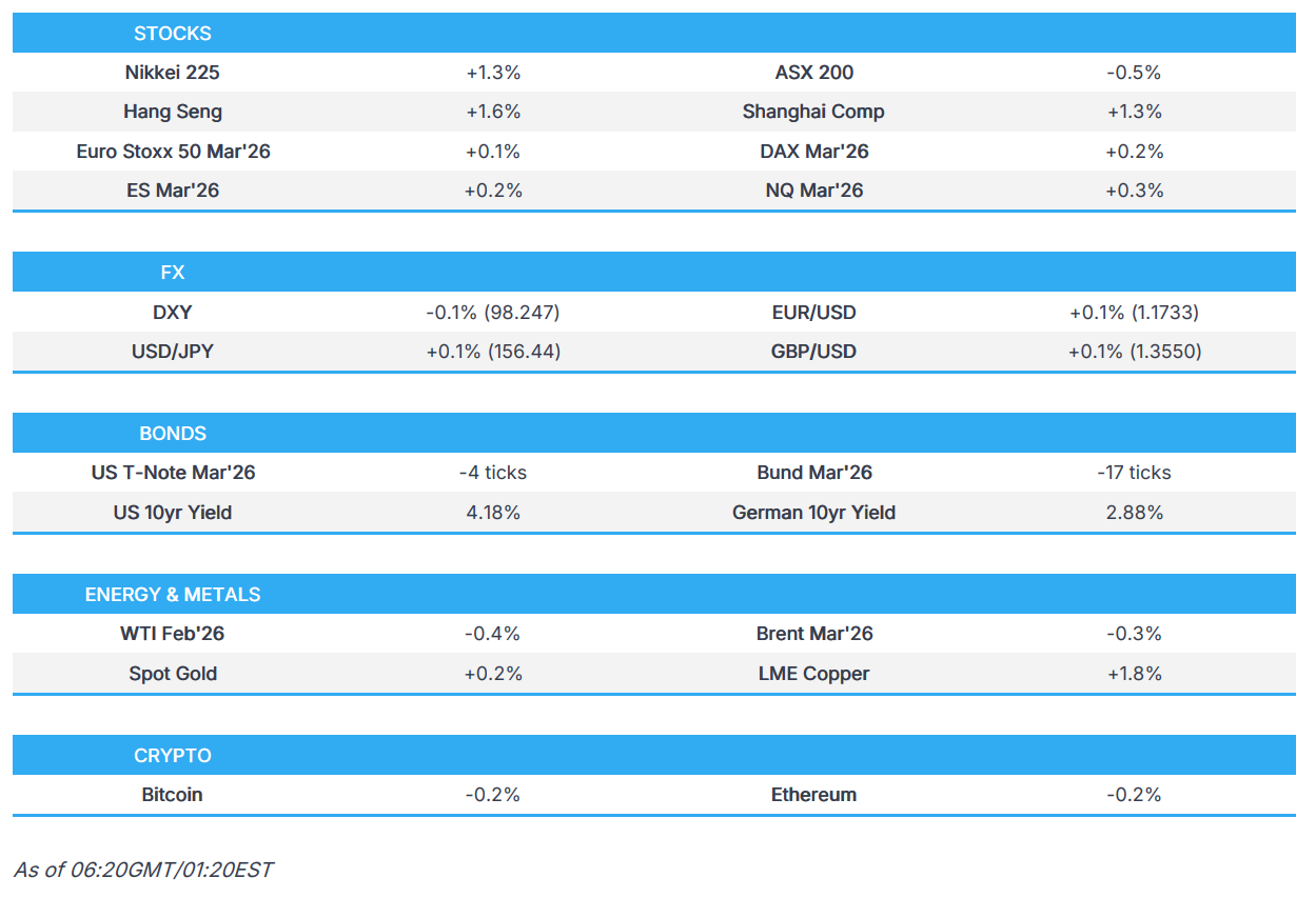 - Crude futures marginally pulled back after advancing throughout the prior US session as participants digested the US strike on Venezuela and Maduro's capture, while it was also reported that Saudi Aramco cut Asia OSPs to a premium of USD 0.30/bbl vs Oman/Dubai.