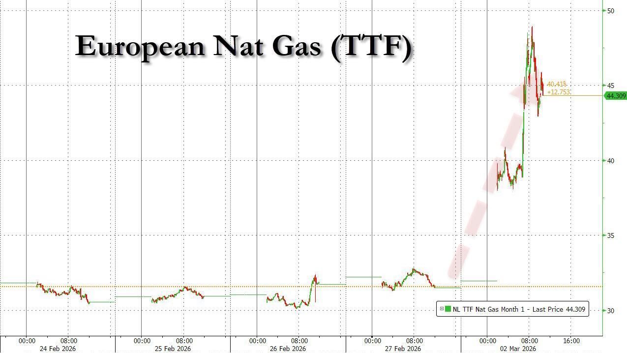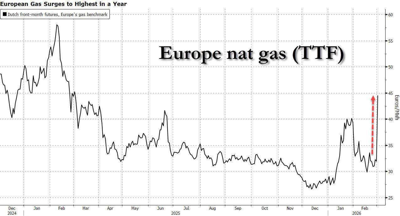 Well, for once Goldman's commodity research desk was spot on... and very quickly at that, because just one day later, TTF shot up as much as 50%, sparking chaos across Europe's energy markets in a deja vu moment of the start of the Ukraine war 4 years ago. Dutch front-month futures, Europe’s gas benchmark, traded 46% higher at €46.77 a megawatt-hour by 2:31 p.m. in Amsterdam. That’s the highest level since February 2025.