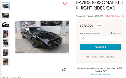 As of Thursday afternoon, bidding for the vehicle is around $975k. The auction's description says if "price exceeded 25% above the reserve price, Hasselhoff will personally deliver the car to the new owner."