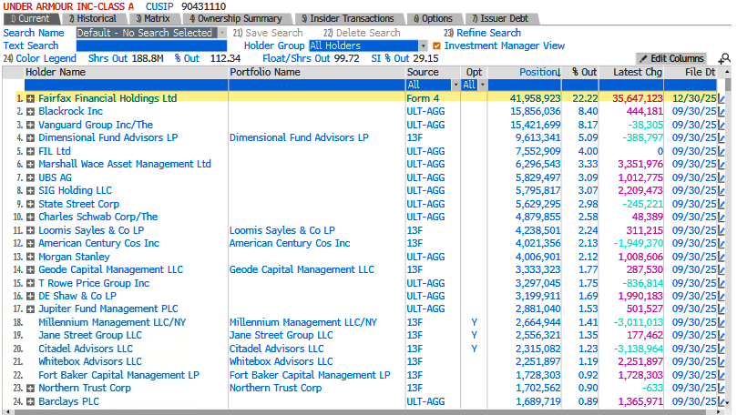 Fairfax Financial Holdings disclosed a 22.2% ownership stake in UA Class A common stock in a new Schedule 13D filing, stating that the position was acquired for investment purposes and could be adjusted over time.