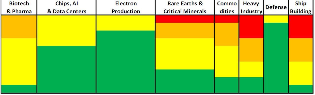 - Processors, refiners, and finished goods manufacturers will likely outperform those further down the supply chain. Yes, the entire chain will do well, but expect benefits to accrue disproportionately to companies that reduce our dependency on China the most. While less dependency on everyone is part of the admin’s goal, those that can address China the best will do the best.