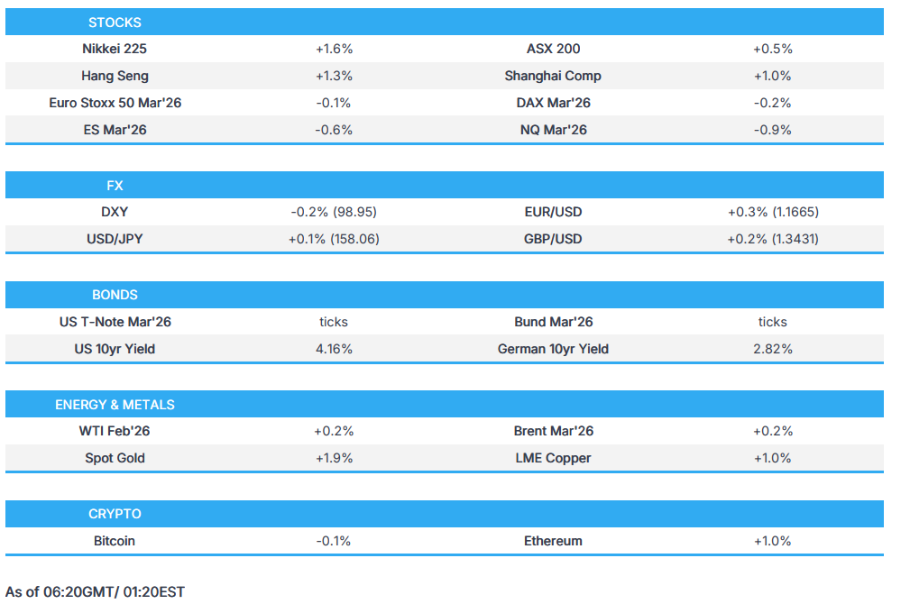 - USD/JPY has traded undecided throughout the APAC session, briefly extending beyond 158.00 and into touted intervention territory following further reporting of PM Takaichi planning to dissolve the Lower House, before selling off to a trough of 157.52 amid global risk-off flows at the time. The pair pared back the majority of its losses, now trading with slight gains of 0.1%.