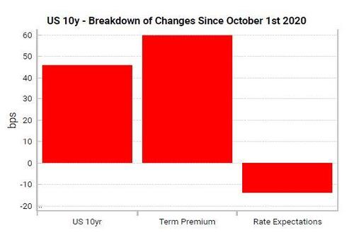 The rise in yields since October has been driven by term premium (the residual of nominal yields and long-term Fed rate expectations), given rate expectations are pinned for several years due to Fed forward guidance.