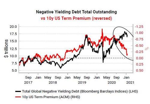 Since September, however, term premium has kept rising despite the amount of negative yielding debt outstanding remaining stable. Bond holders are sensing rising inflation risks, with term premium increasing to compensate them.