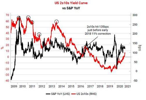 The chart below shows that most local peaks in the yield curve have happened just before or around local tops in the S&P. The 2s10s yield curve only had to hit 135bps in late 2017 to precipitate the 11% correction in early 2018.