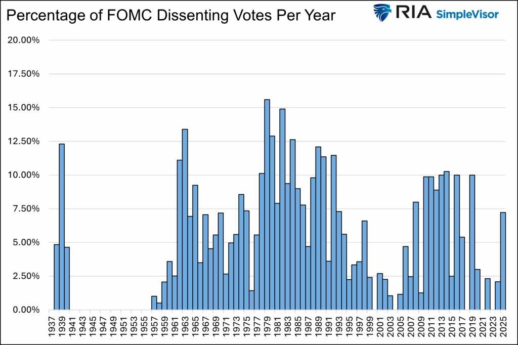 As we shared above, there were two dissenting votes at the last meeting. On average, since 1936, 5% of members have cast dissenting votes per meeting. Since 2000, the most dissenting votes at a single meeting were three. On average, over the last 25 years, the odds are 50/50 that one member will dissent at each meeting.