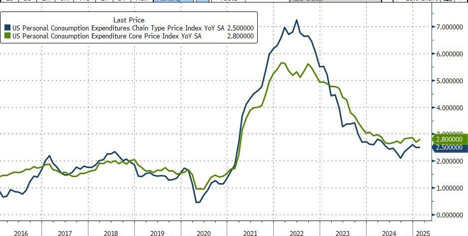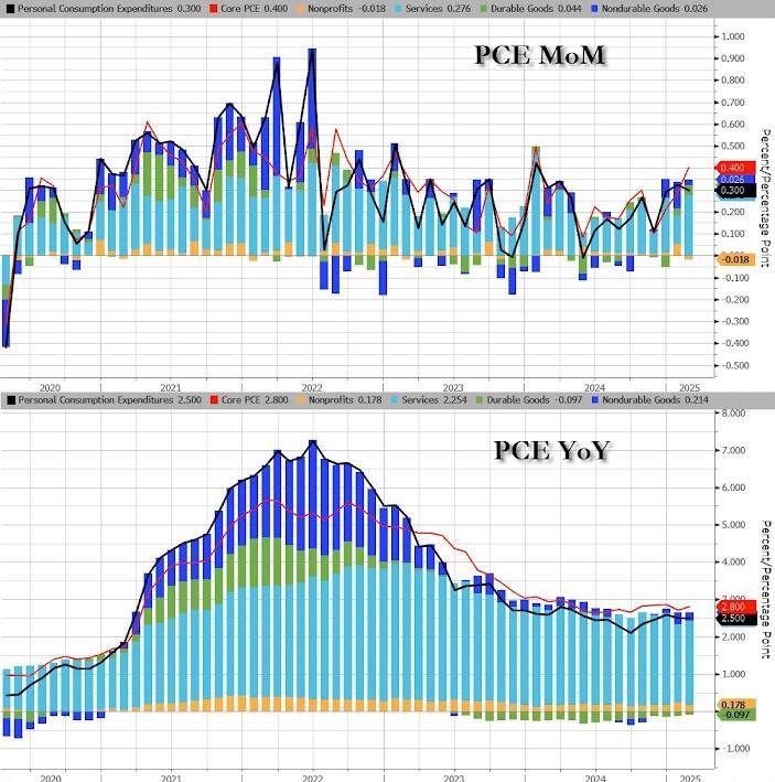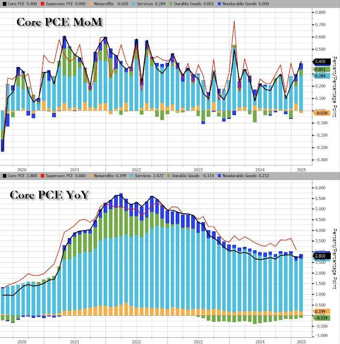The Fed's favorite inflation indicator - Core PCE - printed hotter than expected in February, rising 0.4% MoM, bring prices up 2.8% YoY...