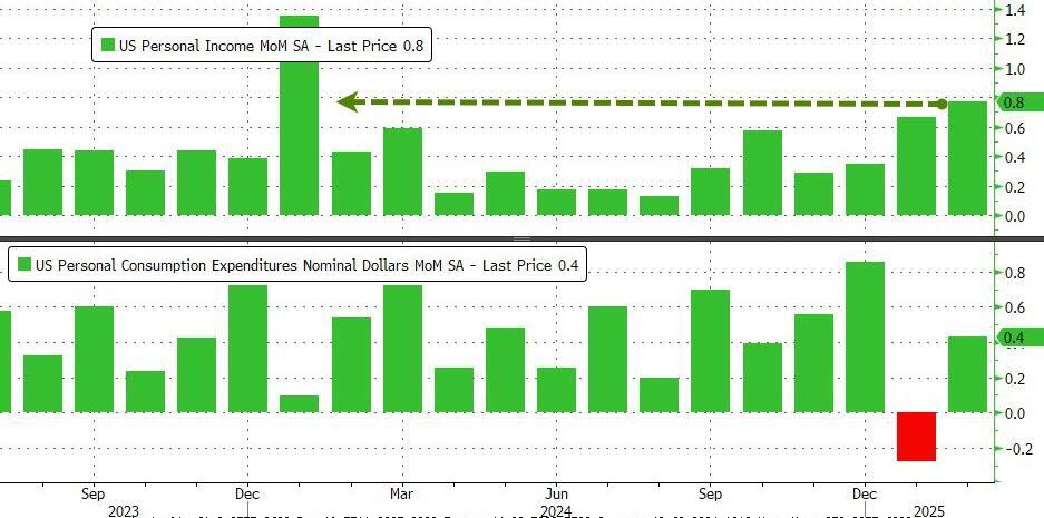 Meanwhile, as prices rose, so did personal income, jumping 0.8% MoM - the most since Jan 2024, considerably outpacing the 0.4% rise in personal spending...