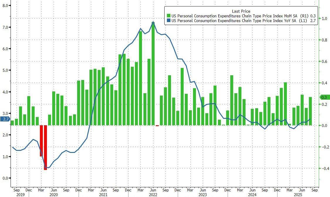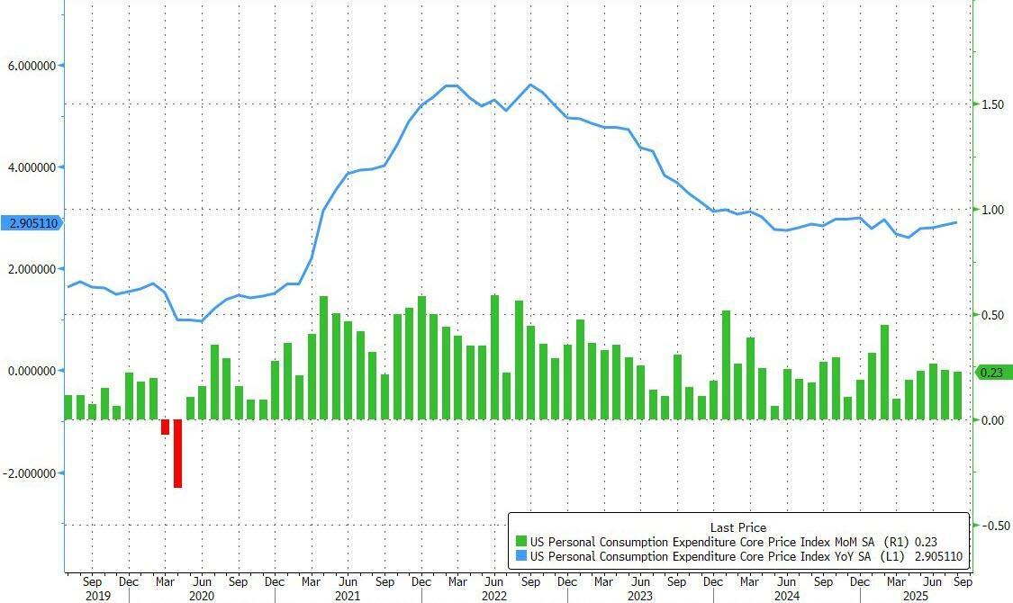 After a modest increase two months ago, and a steady print in July, analysts expected headline PCE to be steady at +2.6% YoY in August and Core PCE - the Fed's favorite indicator - to also be unchanged at 2.9% YoY... and the numbers all came in right in line with expectations.