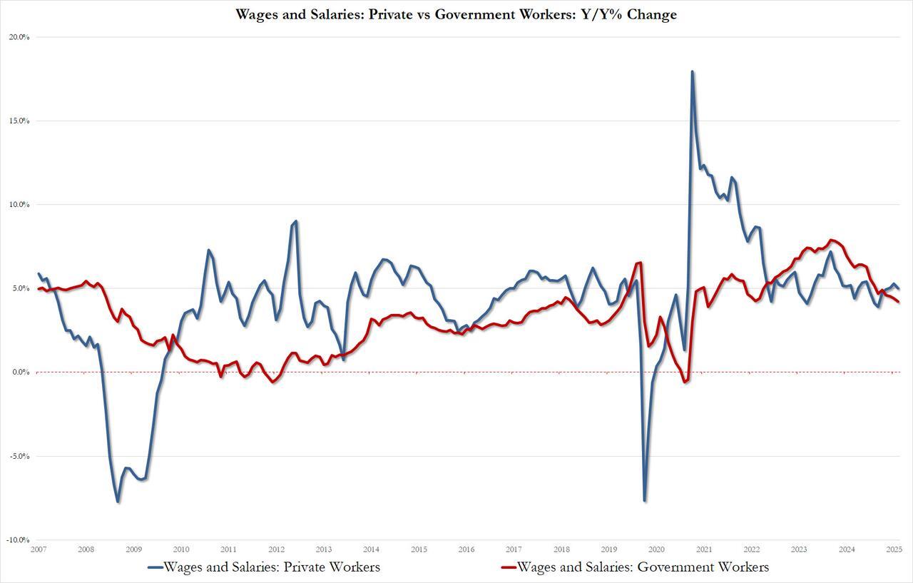 On the income side, there was more good news: after outpacing the private sector for nearly three years, wage growth of private workers (5.0% YoY) is once again rising faster than government workers. In fact, government worker wage growth of 4.2% was the lowest since August 2021.