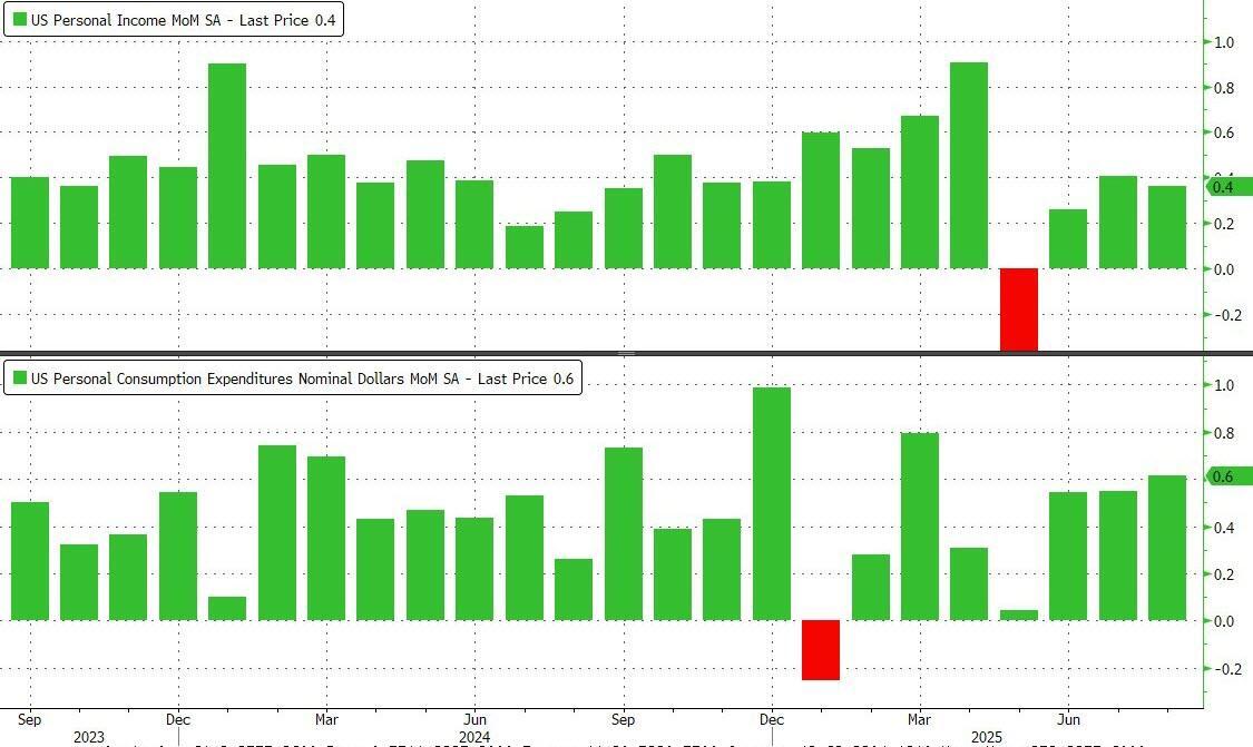 While prices are rising but in their recent normal range, income and spending both came in a fraction hotter than expected, up 0.4% MoM (above exp. 0.3%) and 0.6% MoM (above exp. 0.5%) respectively...