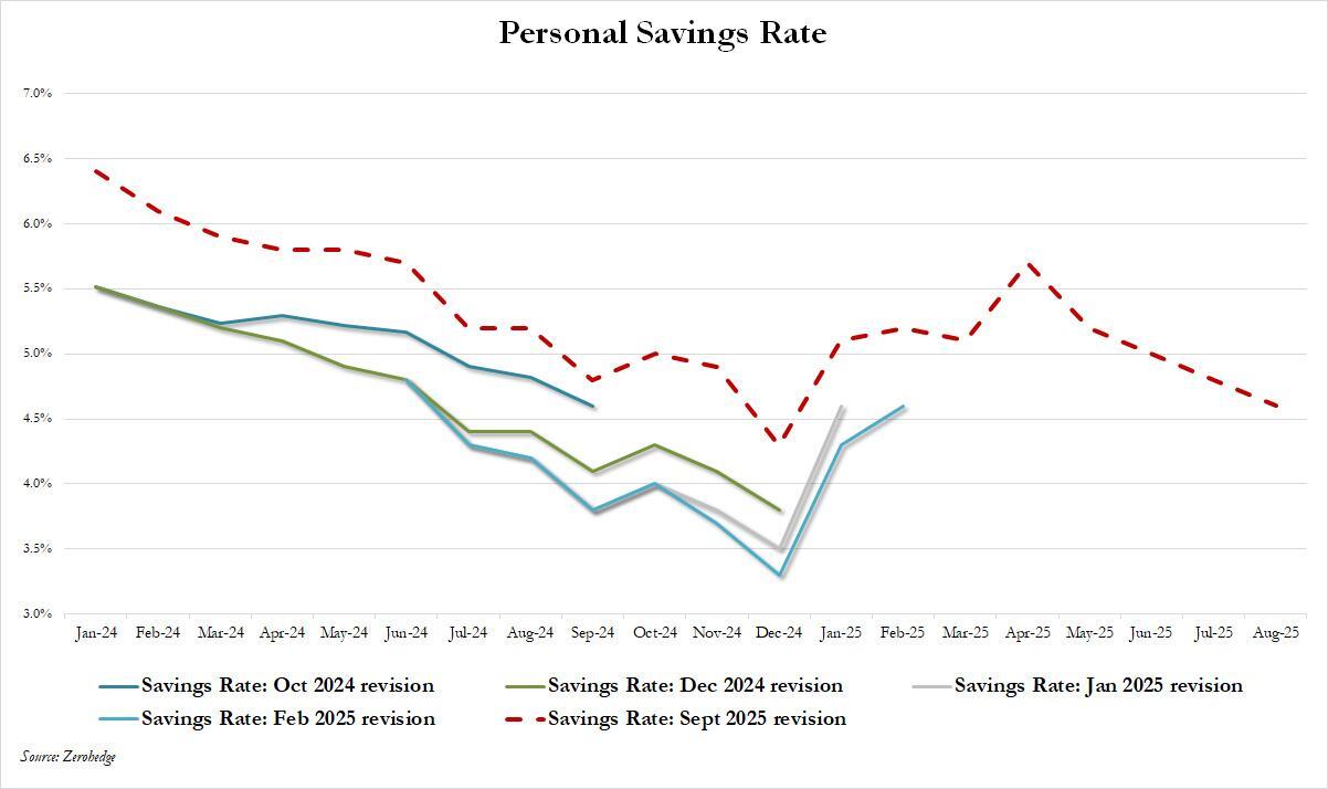 With spending growth outpacing income, it naturally meant that consumer had to dig into their savings, and sure enough the personal savings rate dropped to a new 2025 low of 4.6% from 4.8%, which in turns follows the comprehensive data revision published yesterday, and which lifted the savings rate by about 1% across the board historically (the various data revisions are shown below).