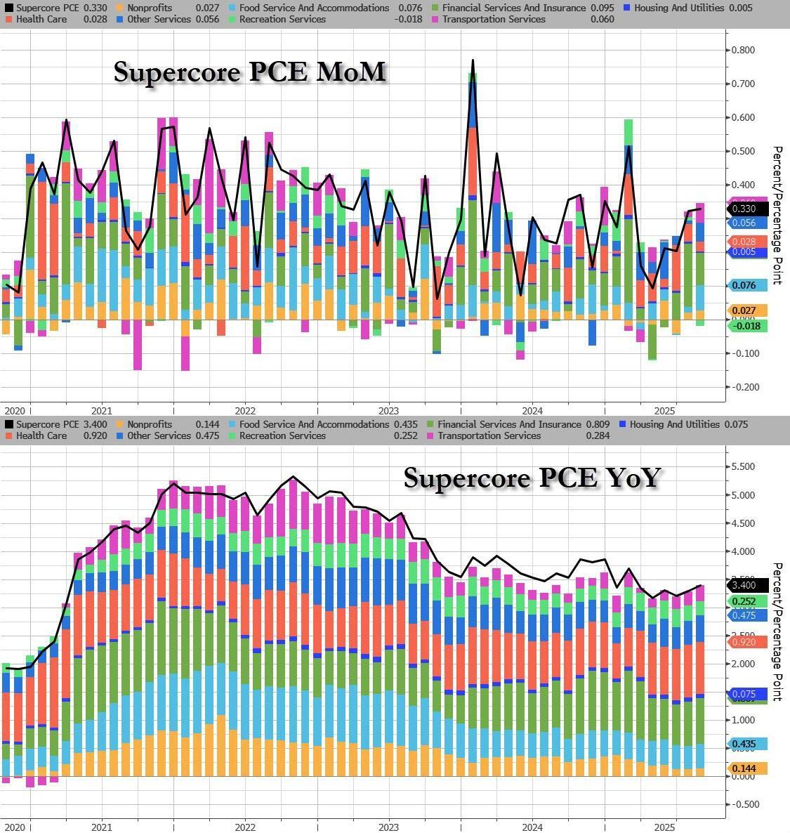 For the second month in a row, Financial Services costs (i.e., soaring stock market and associated services) dominated SuperCore prices (and certainly have nothing to do with tariffs at all). Food services and transportation costs also boosted Supercore.